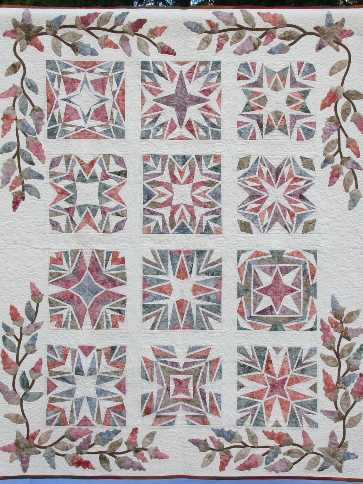 This 56” x 71” quilt features twelve intricately pieced blocks and beautifully hand-appliquéd borders, created using patterns and fabrics by Starr Design Fabrics. The soft pastels of the hand-dyed fabrics used in the quilt’s construction evoke a garden in full bloom, bathed in the gentle glow of a full moon.